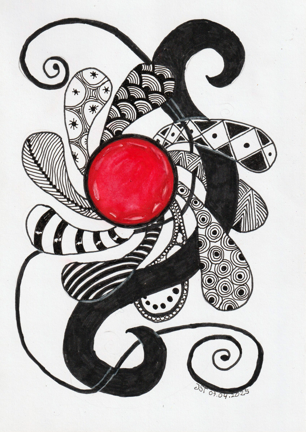 Eine Rose mit Zentangle Mustern und Ornamenten. Anschliessend leicht coloriert.