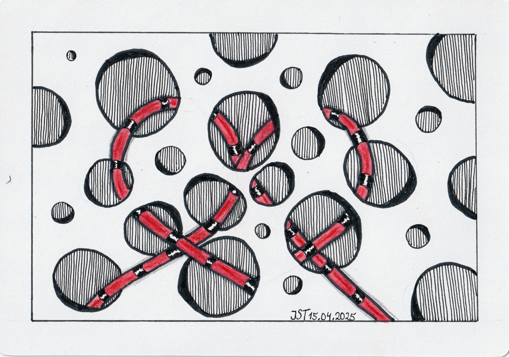 Stifte : Bleistift Faber Castell Fallminenstift 3.15 6B zum vorzeichnen, Sakura Pigment Stifte in Schwarz 0,03 bis 0,8, wasservermalbare Aquarellfarben, Faber Castell Pitt Graphite Matt 14B für die Schatten, Fixativ von Gerstaecker,