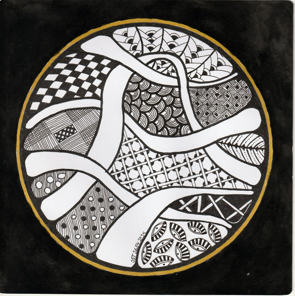 Zentangle NeuroArtGrafik : Kreis mit NeuroArt Elementen, auf schwarzen Hintergrund (mit China Tusche schwarz) und als Rand mit Gold.