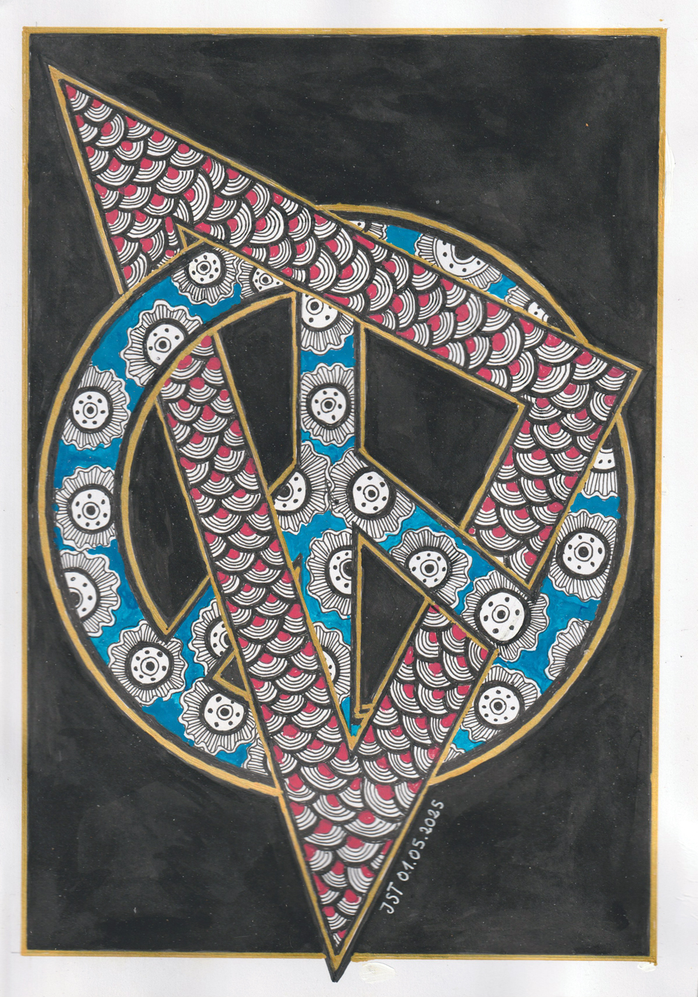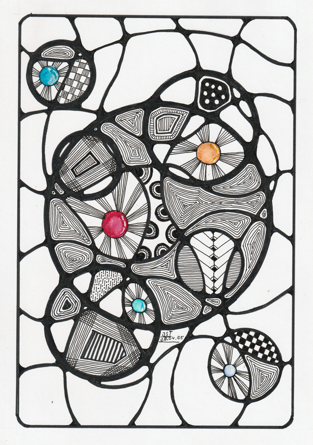Zentangle / NeuroArt : Kreise und Linien, die sich verbinden. Kreise mit Zentanglemustern und Edelsteinen gefüllt.