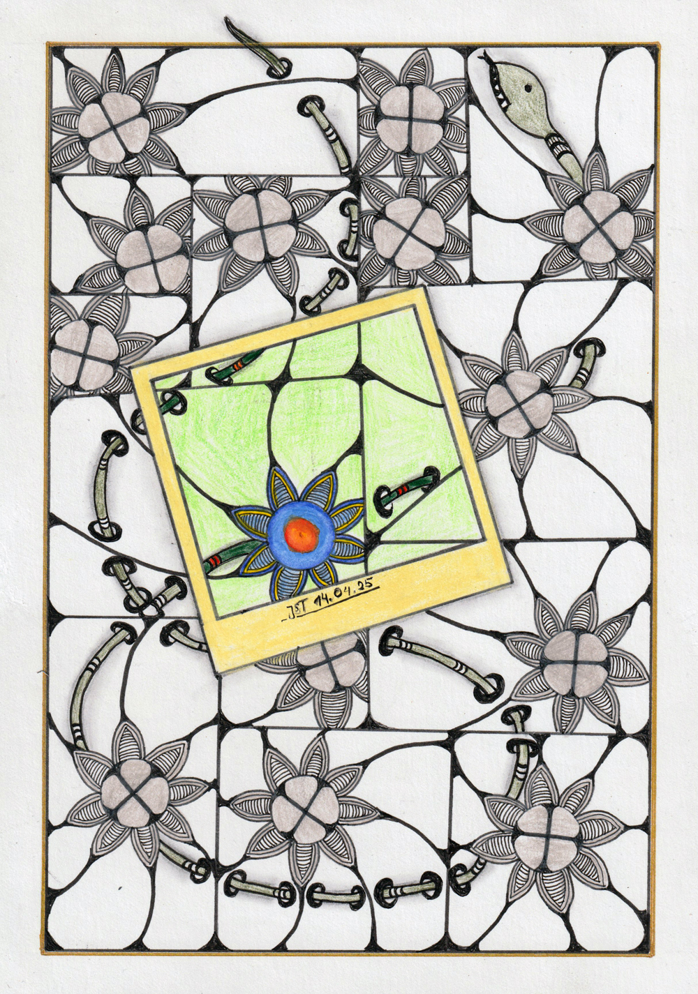 Zentangle / NeuroArt : Linien mit Blumenmustern, sowie eine Schlange, die sich durch das gesamte Bild zieht. Verziert mit einem FotoRahmen, das farbig gestaltet wurde.