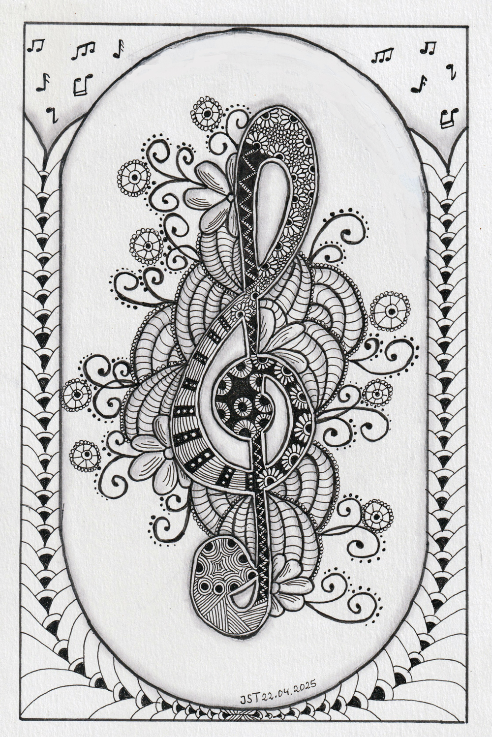 Zentangle : Schwarz / Weiss gezeichneter Notenschlüssel. Mit Blumenmuster und Notenzeichen.
