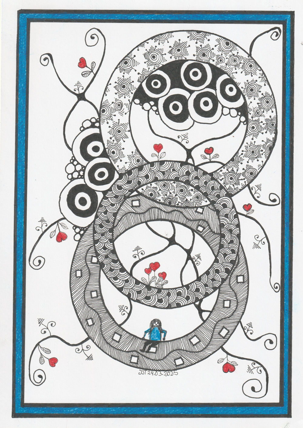 Zentangle /NeuroArtGrafik: Sich verbindende Kreise. Verziert mit Zentangle Mustern und roten Herzen und Blumen.