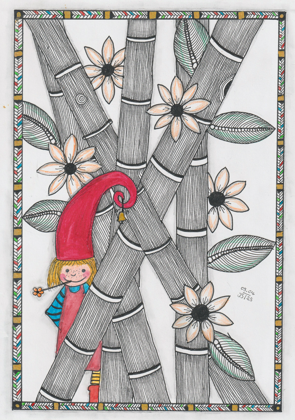 Zentangle : Hier einmal was Lustiges und Freches. Holzstäbe hinter dem sich ein Kind / Wichtel frech hervorlugt. Dazu ein paar Blumen. Gestaltet mit wenig Farbe.